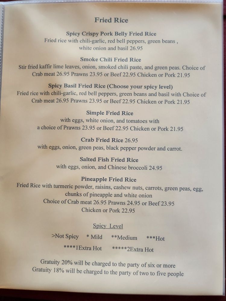 Fried rice with chili-garlic, red bell peppers, green beans, and basil with your choice of crab meat, prawns, beef, chicken or pork. Choose your spice level.