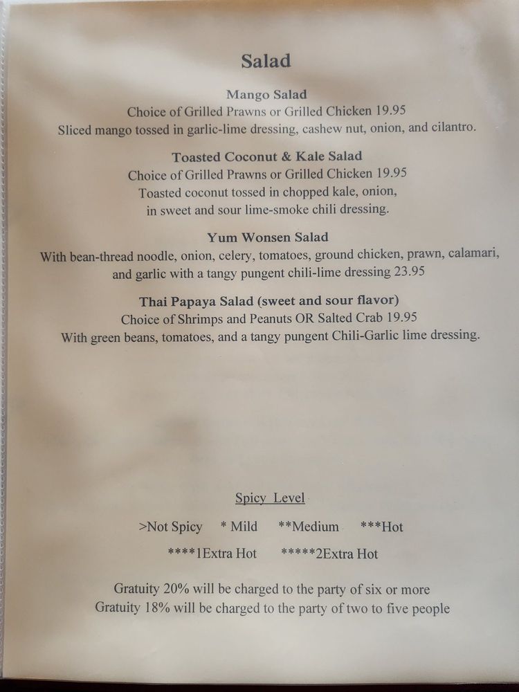 Prepared with bean-thread noodles, onions, celery, tomatoes, ground chicken, prawns, calamari, and garlic with a tangy pungent chili-lime dressing.
